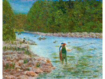 The landscape painting depicts a Casting for Recovery participant in a trout stream with her ghillie from Trout Unlimited. The painting is done in an impressionist style by Jim Hefley, an artist from Asheville, NC.