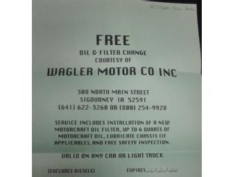 This certificate is good for one oil and filter change courtesy of Wagler Motor Co Inc. Service includes installation of a new Motorcraft oil filter, up to 6 quarts of Motorcraft oil, lubricate chassis (if applicable), and free safety inspection.