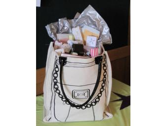 SILENT--- This adorable and practical tote bag is full of a sampling of elite beauty and skin care products for complete personal indulgence. Enjoy scented candles, soaps, makeup, perfume, skin care cremes and serums. Make yourself look and feel beautiful - it's all right here in this grab and go beauty spa bag!