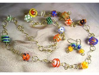 Brightly colored tactile glass beads with swirls and bumpy dots enhance this great necklace with matching earrings. Each link is handmade from gold-tone wire with lots of curves and loops. This necklace will be lots of fun to wear and will brighten any outfit. Necklace is approximately 30 inches long. This charming jewelry set includes matching earrings. The essence of Deb Rich's artistic expression is revealed in each lampwork bead that she creates in her studio. Deb's beads exhibit her desire to create and inspire change through community outreach. These jewelry pieces are offered exclusively through cMarket to support the fundraising efforts of non-profit organizations. Lampwork glass reflects both the heartfelt passion and interpretative expression of Deb Rich. Her artistic resume includes fantasy sculptures, creatively fashioned from found-objects and recycled materials. Deb's Glass Designs are truly hypnotic, one-of-a-kind pieces that cannot be replicated or manufactured by a machine. Deb only sells jewelry pieces that capture the grace and flow of glass artistry. All jewelry is made with sterling silver or copper findings, Czech or Swarovski Crystals, and various complementary beads, making Deb's Glass Designs positively the best choice.