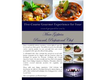 Enjoy a wonderful culinary experience custom-tailored especially for you and your three guests. You will be treated to five delectable courses expertly prepared by your personal chef; each course accompanied with a specially selected wine pairing.
