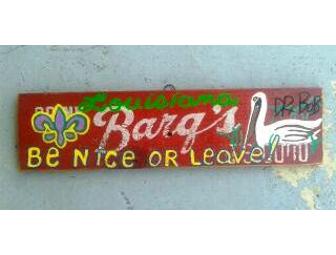 "Be Nice or Leave" sign on red with pelican by the venerable Dr. Bob, 16.5" x 4"