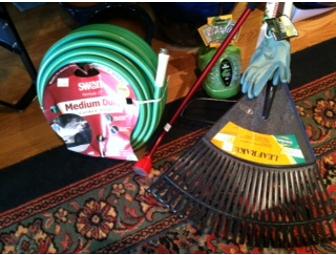 Just in time for spring yard work: Garden gloves, knee pads, 30" sprinkler want, bowhead rake, leaf rake and 100' garden hose.