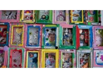 Individual photo portrait shadow boxes containing treasures selected by your child in a decorated frame.
