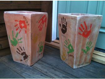 Cooperative set of handsome large clay planters decorated with student handprints.