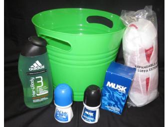This basket includes Avon Musk Marine Cologne Spray, Avon Musk Marine Roll-On Anti-Perspirant, Avon On Duty Roll-On Anti-Perspirant, Adidas Hair and Body Active Start, and Expandable Loofah.
