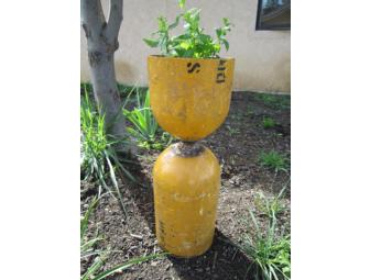 This planter is the creative art of 10th grade Summerfield student,Kai Sadler. It is meant to hold a potted plant, and it can be turned with the short-end up or down. However you like it best. Made from RECYCLED fire extinguisher.