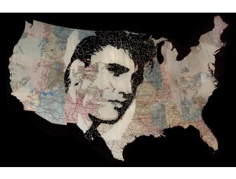 "RoosevElvis 2012" (20"x31" unframed, "24"x37" framed) is a found road map of the United State overlaid with silhouettes of Theodore Roosevelt and Elvis Presley in a rumination on the iconography of American Masculinity. The piece incorporates silk screen printing into the artists' signature technique of elaborately cutting maps to leave a lace-paper, arterial network of roads and rivers.