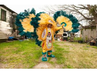 Winky poses outside the home of his grandfather, Big Chief Monk Boudreaux of the Golden Eagles Mardi Gras Indians, on Mardi Gras Day February 21, 2012, in New Orleans, LA. Photo by Erika Goldring, pigment ink on museum-quality watercolor paper. Photo is matted and framed. Frame by David Bergeron of Bergeron Woodworks. Photo measures 17"x23". Frame measures 22"x28".