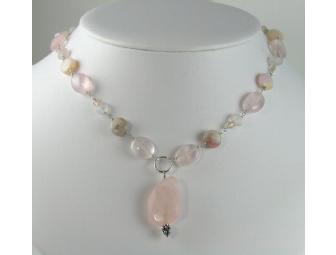I handmade this sterling silver necklace with an assortment of rose quartz, pink freshwater opals, and a large faceted rose quartz piece hanging from the center.