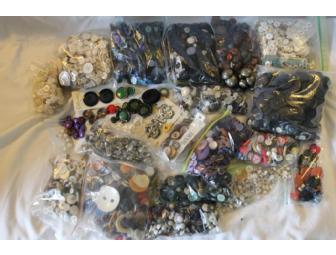 Hundreds and hundreds of buttons of many shapes and sizes and materials, collected over decades. Wood, cloth, metal, leather, glass, mother-of-pearl and more. They are somewhat sorted by colors, size, material, etc. Approx. 15 lbs. A collector's delight!