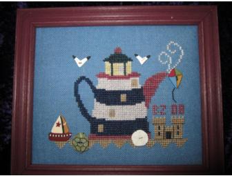 Handcrafted Counted Cross Stitch Framed Artwork - Lighthouse Teapot