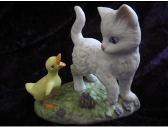 "Too Close For Comfort" (1992) warmly captures a curious kitten's playful moment of discovering a duck getting a little too close.