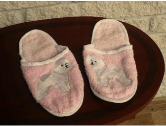 Pink cloth slippers with easy grip soles embroidered with, what else? A beautiful Bichon Frise.
