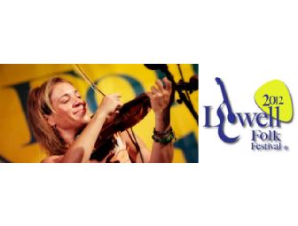 A Lowell Folk Festival 25th anniversary tote bag including 6 vintage LFF t-shirts from 2007 - 2011, a vintage LFF hat, a 20th anniversary LFF CD and a commemorative LFF water bottle. And don't forget to join us July 27-29, 2012 in historic downtown Lowell for 3 days of food, folk and fun!