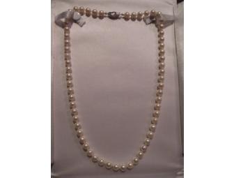 This strand measures 18.75", consisting of 61 luscious pearls (7.0mm in size) with a beautiful 14K white gold secure safety clasp. the clasp is reversible, each side set with a diamond.