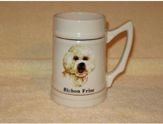 Ceramic stein with a smiling Bichon. Fill with your favorite beverage. On the back is a description of Bichons. The stein is 3.25" across the top and increases to 4" at the bottom and is 5.5" tall.