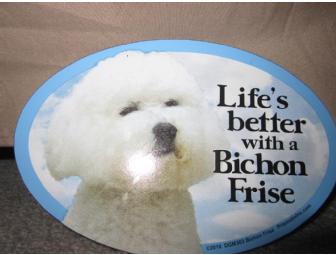 Oval magnet for the car or the fridge. Says "Life's better with a Bichon Frise"