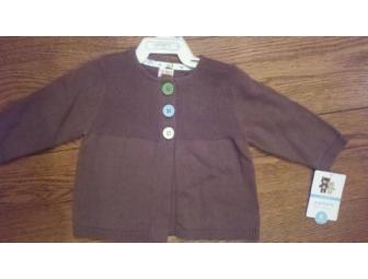 Carter’s Girls swing style cardigan sweater. Brown cotton with green/blue/white buttons. Size 6mos. This item is new with tags.