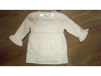 Koala Baby Boutique holiday dress. Pale pink knit with gold lurex thread for a subtle and very pretty shimmer. Long ruffle edged sleeves, rib knit bodice with empire waist, two front pockets. Matching bloomers/diaper cover. Size 3-6mos. This item is new with tags showing $39.99 retail.