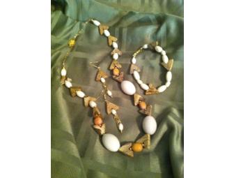 Necklace is 24 inches in length. The three large stones are Opal. The V-shaped stones are Desert Jasper. There oval stones of Honey Jade along with carved Bone beads. The spacer heads are gold-plated and saucer shaped.The clasp is a lever. The bracelet is eight inches in length, created from the same stones as the necklace with white Onyx spacers. The clasp is a lobster claw. The earrings hang three inches and have the identical beads as in the other pieces.