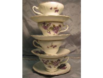 Antique english style china tea cups with hand painted forget-me-nots. Set is trimmed in gold-leaf.
