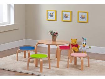 This Legare table set will give your children a space of their very own. This set comes complete with a natural birch Bent Ply Kids Table with 4 multi-colored stools. The tabletop provides a spot for reading, coloring or other daily activities. It's the perfect addition for their room or play area. Provide the perfect modern playstation for kids with this Legare Bent Ply Kids Table Set.