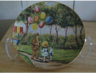 This gold-rimmed 8.5 inch plate depicts a work by American artist Dominic John Mingolla entitled "The Balloon Man." It is impressionist in style, with colorful balloons and wistful characters standing on a path in a pastoral setting.