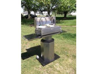 Grill with stand is by Heat Surge, makers of electric Amish fireplaces. The grill and stand are all stainless. The grill has a large 11"x25" cooking area, and uses both propane and infrared heat. The stand is 34" high, with 12"x16" extensions on each side, and has two wheels on the back for easy maneuverability. The set includes a propane hose, stainless cleaning paste and polishing cloth, a probe thermometer, owner's manual, and cover. The grill easily detaches from the stand for on-the-go cooking.