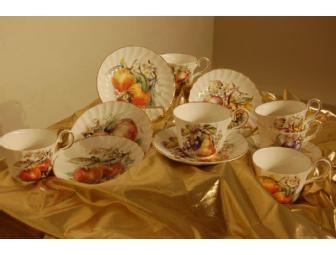 Vintage set of six matching teacups and saucers. Teacups and saucers have a scalloped edge with gold trim and each is delicately handpainted with fruit: pears, grapes, and peaches. Excellent Condition. Marked Regency Bone China, Made in England.