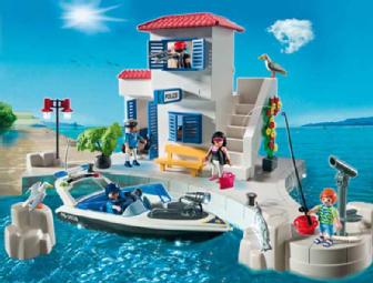 PLAYMOBIL 5128: With lockable prison cell. The speedboat is upgradeable with the Underwater Motor. The harbour dock and the pier from the Car Ferry (5127) can be attached. Dimensions : Harbour Dock with Building: 66 x 40 x25 (LxWxH)