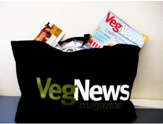 This VegNews gift pack includes a one-year subscription, the current issue of VegNews, an over-sized tote bag and and six vegan cookies.