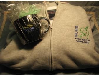 WUMB vintage logo hooded sweatshirt, size xxl with black WUMB current logo coffee mug