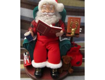 He has a coffee cup in one hand and book in the other. His voice is crisp and clear. Turn on Santa's switch and watch his head move up and down as he reads one of three books. Santa reads them when they are inserted into his hand.