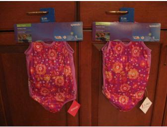 Two small size Flotation Swim Suits by Speedo! (age 1-2; weight less than 33 lbs) Allows for ease of movement in the water. Zippered pockets keep inflatable air chambers in place. Adjustable flotation for building swim skills! Adorable pink and purple flower design!