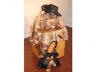 - "Jazzd" large black leather, two-strap bag, lined in a leopard print fabric, and with a satin leopard print scarf "woven" throughout, forming a bow at the front of the bag,