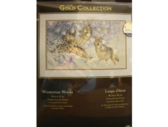 Wintertime Wolves design is by Larry Fanning. Kit includes cotton thread, 16-count, dove-gray cotton aida, color-coded thread sorter, needle, and instructions. Finished size is 18" x 11".