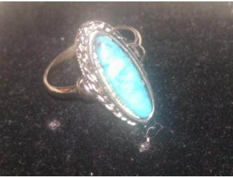 A great addition to any style jewelry collection! Indian style costume ring is silverplated with faux turqoise and is adjustable.