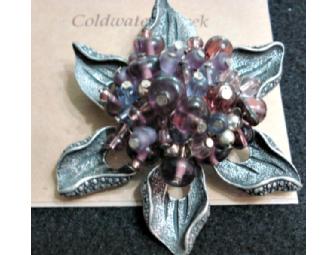 Coldwater Creek Cluster Leaf Flower Pin. This pin is very interesting-antiqued look silver tone of six petals with a flower center that rises up an inch with mauve/purple/silver beads- multi seasons of use from this pin. Needs a sturdy coat or jacket or hat- it's a fairly heavy pin. Makes a nice gift for a friend or lady in your life.