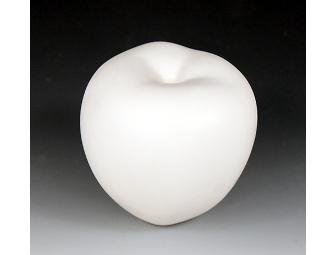 Porcelain sculpture with stainless steel stand: apple is 7"x9"x6"