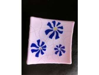 Nelson Veins #3 is an 8X8 inch square but gently rounded dish of fused blue-on-pink art glass. The pink glass is made with 22K gold and has a soft gold glow when held up to incandescent light.