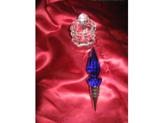 Beautiful Sorelle blue crystal wine stopper and clear crystal collectible jar with removable lid. The beginnings of a nice wedding gift or for your personal use.