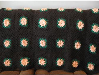Lucious chocolate brown blanket with apricot flowers and green leaves, all hand crocheted for your cozy comfort!