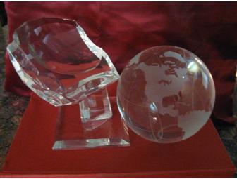 This classy etched globe rests on a crystal "hand", a great addition to your office or globe collection!