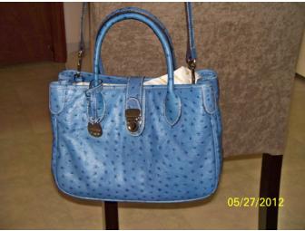 This is a brand new, unused leather tote bag which I bought for myself, in the hopes of downsizing my purse. Alas, it was a little too small for my needs. It is a beautiful bag which closes with a push-lock. The interior has 3 slide-in pockets and 2 more pockets which zip closed. The bag has the faux ostrich embossing and is a very beautiful shade of blue. There are 4 metal feet on the base. The overall size of the bag is 11.75"W x 5"D x 8"H. The drop of the double handles is 5". With the detachable strap, the drop increases to about 15".