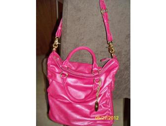 This is a brand-new, unused leather handbag made by Brahmin, in the prettiest shade of pink. I believe the name of the style is "Elle". The sides of the bag are gently ruched and it closes on top with an extended gold-tone zipper. The approx measurements of the bag are 12"H (excluding handles) x 5"D x 14"W. The drop of the double handles is 4.5". A detachable strap is included, which extends the drop to about 10". The bag has two interior pockets that zip shut, 2 open pockets, and a key leash.