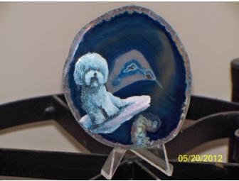 This is a small work of art, featuring a Bichon with an inquisitive, friendly look on his face. The blue agate is approx 3.5"H x 3.25"W and comes with its own display stand. It's just the right touch for a quiet space in your home.