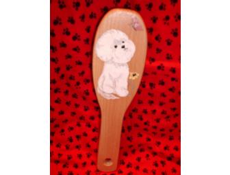 WHAT FLUFF WOULDN'T LOVE TO HAVE THIS WIRE BRISTLE GROOMING BRUSH FOR THEIR VERY OWN. THE BRISTLES ARE FIRM YET PLIANT ENOUGH NOT TO CAUSE ANY PAIN OR COAT DAMAGE. EACH BRISTLE HAS A PROTECTIVE "NUBIN" ON THE END. ON THE WOODEN HANDLE THERE'S A HAND PAINTED SWEET LITTLE BICHON WITH HIS/HER EYES FOLLOWING THE PRETTY LITTLE BUTTERFLY ABOVE.