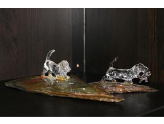 Glass Basset Hounds on Slate Stands--These 2 adorable Glass Basset Hound characters are mounted on Polished & sealed Slate. One Basset is simply a Basset Hound in a front bow stance & the second is a Basset carrying his Teddy friend. One of the pieces is labeled "Deanna Norris 8/99". Both pieces are in excellent condition with no chips or cracks.
