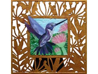 "I wanted to capture the aerial maneuverability of these little creatures with this mosaic. I've always been impressed and fascinated with their ability to stop on a dime, investigate something then dart about completely uninterested in what caught their fancy in the first place. I hoped that by stacking the glass and having the wings coming off and out of the mosaic, I could reinforce this sense of action."